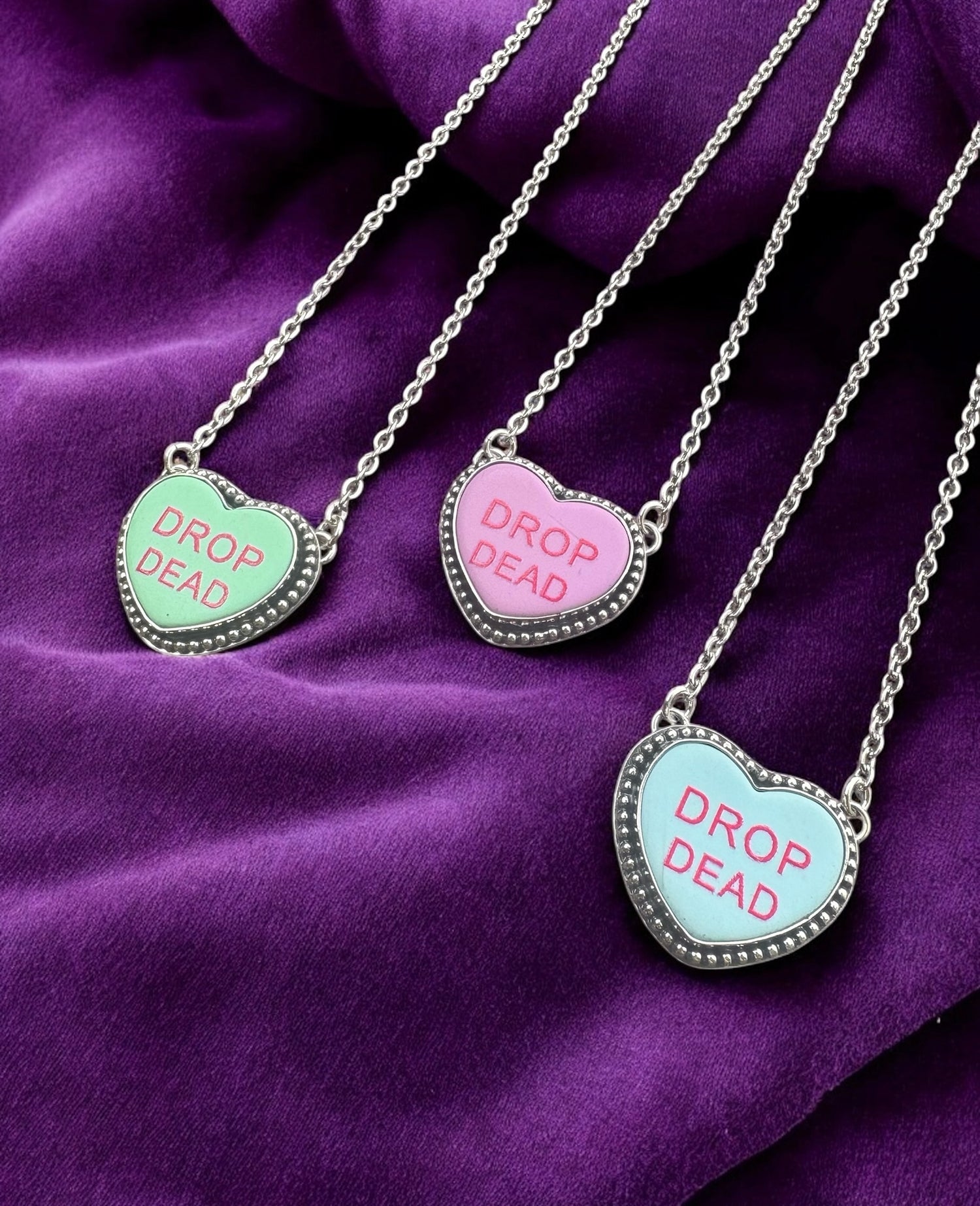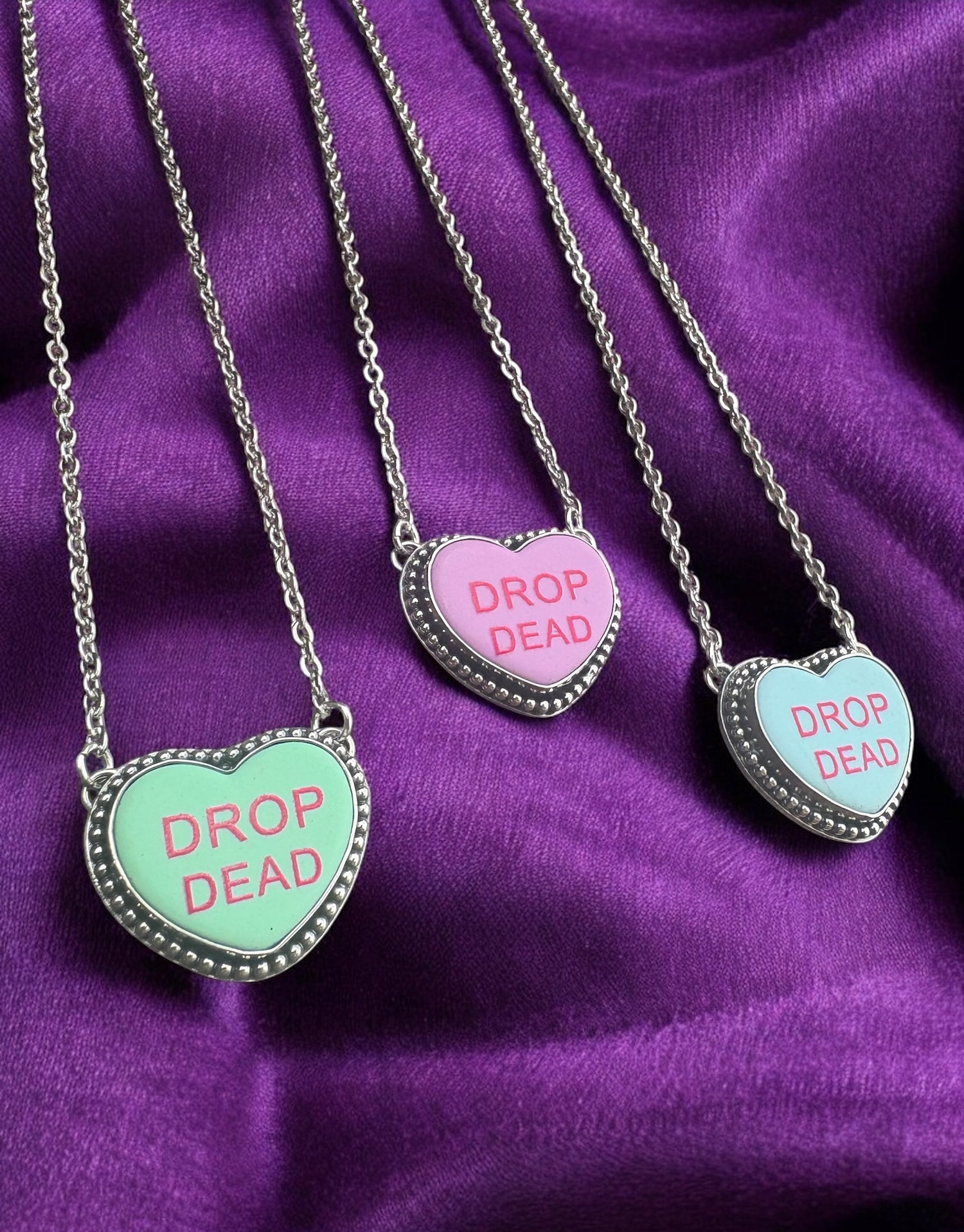 Hand-crafted in sterling silver, each pendant carries the playful whisper of a conversation heart — with a macabre edge. Polished to a ghostly gleam and hung from a sterling silver chain, this piece is both creepy-cute and unapologetically gothic.