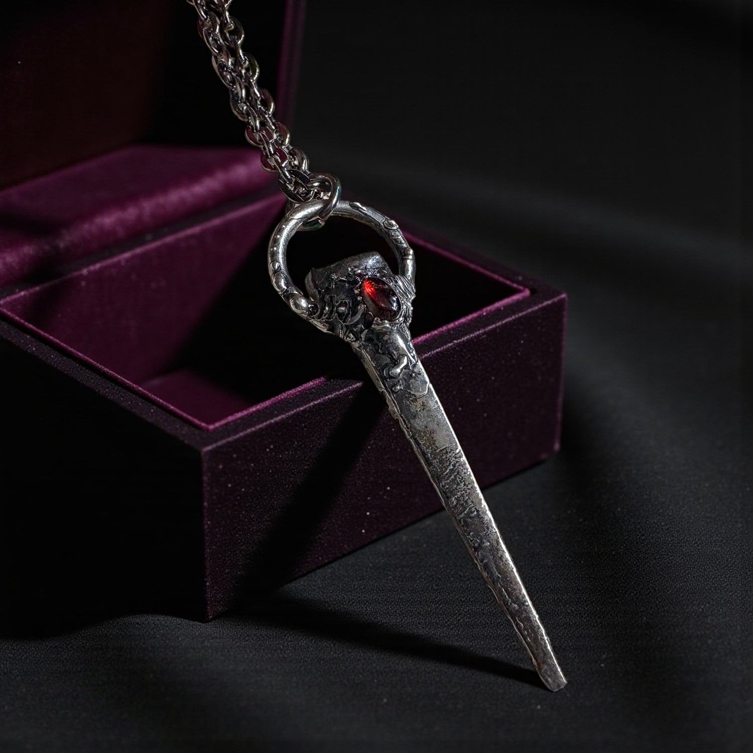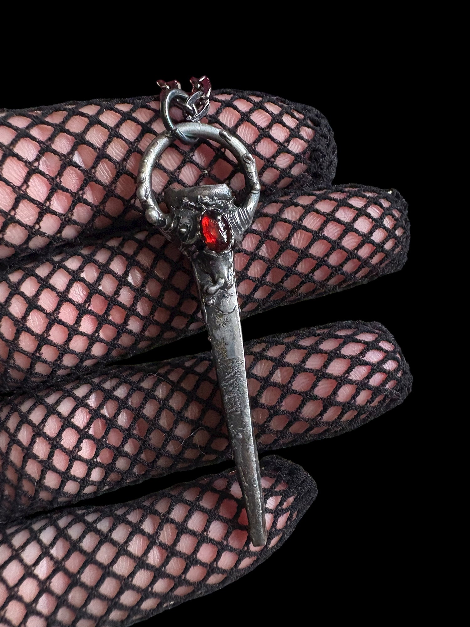 Don't miss out on the opportunity to own this captivating piece of art. Embrace your unique sense of style with the Blood-drop~Hand Crafted Antique Coffin nail with garnet Tiffany technique pendant necklace.