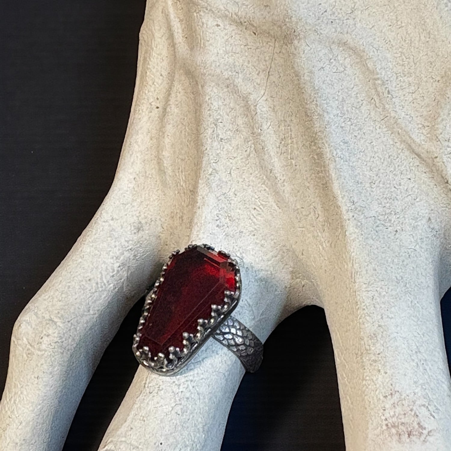 Haunted~Sterling and fine Silver coffin cut garnet ring size 6.5